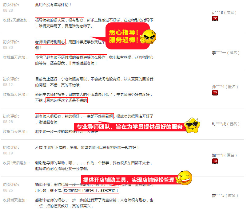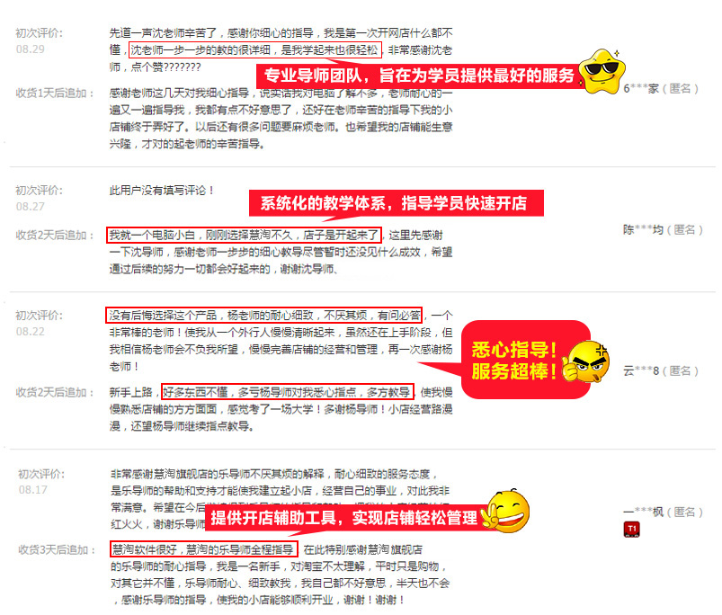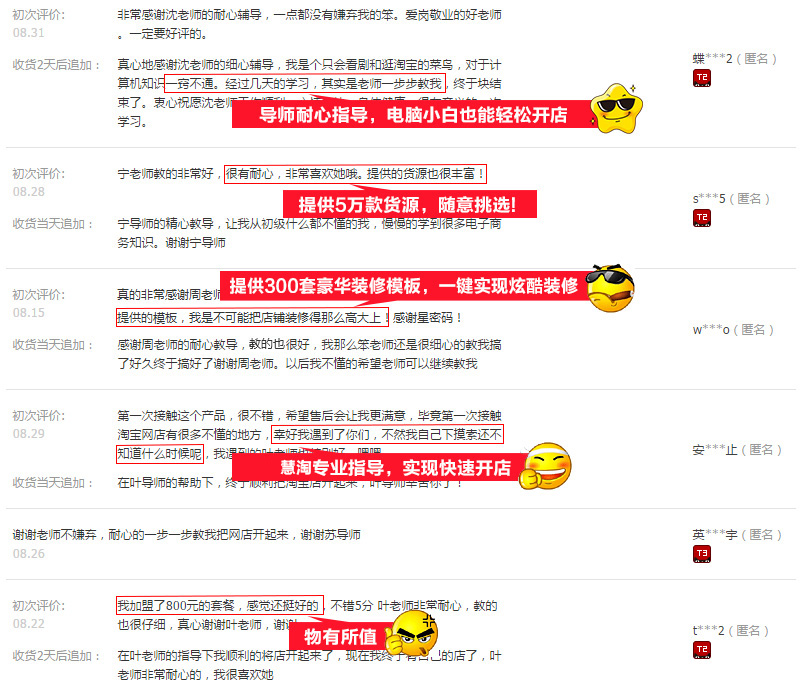多家对比后,最终选择了慧淘,企业实力雄厚,导师经验丰富,系统化的操作指导,并且提供多种货源,终于把店开起来了,有什么问题还能随时咨询导师,比网上搜来的那些教程靠谱多了!